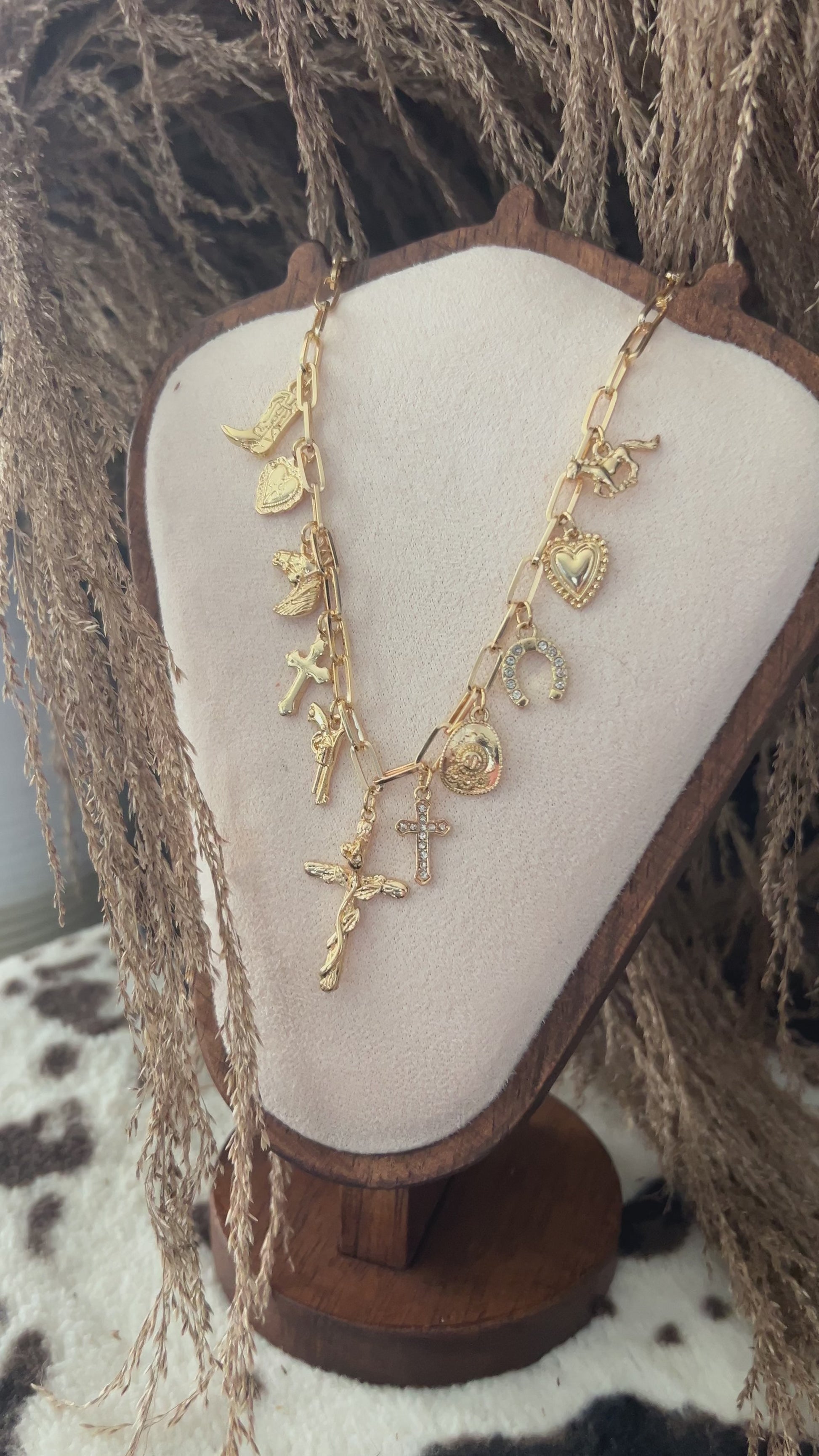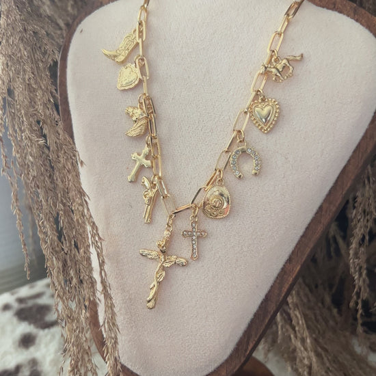 The Elowen Faith Charm Necklace is a meaningful statement piece designed to tell a story of faith, love, and protection. Featuring a bold gold-tone chain adorned with thoughtfully curated charms—including crosses, hearts, angel wings, and western-inspired details—this necklace blends spiritual symbolism with modern boho flair.