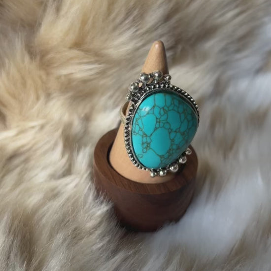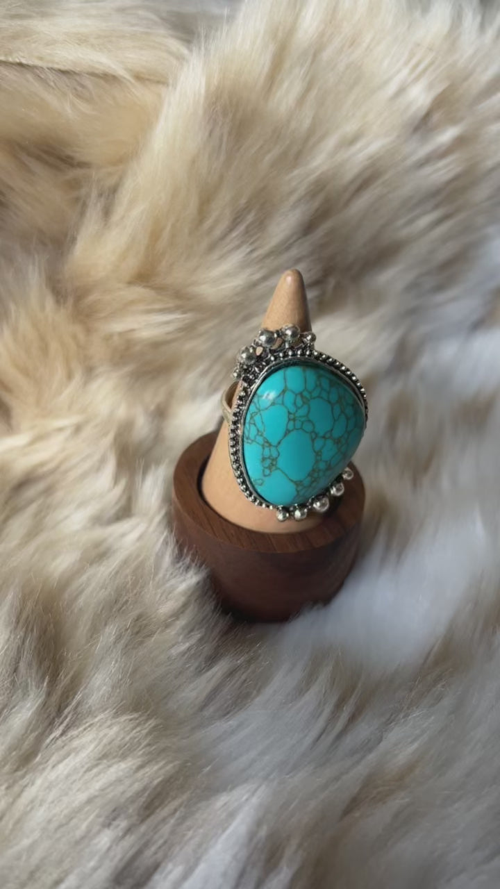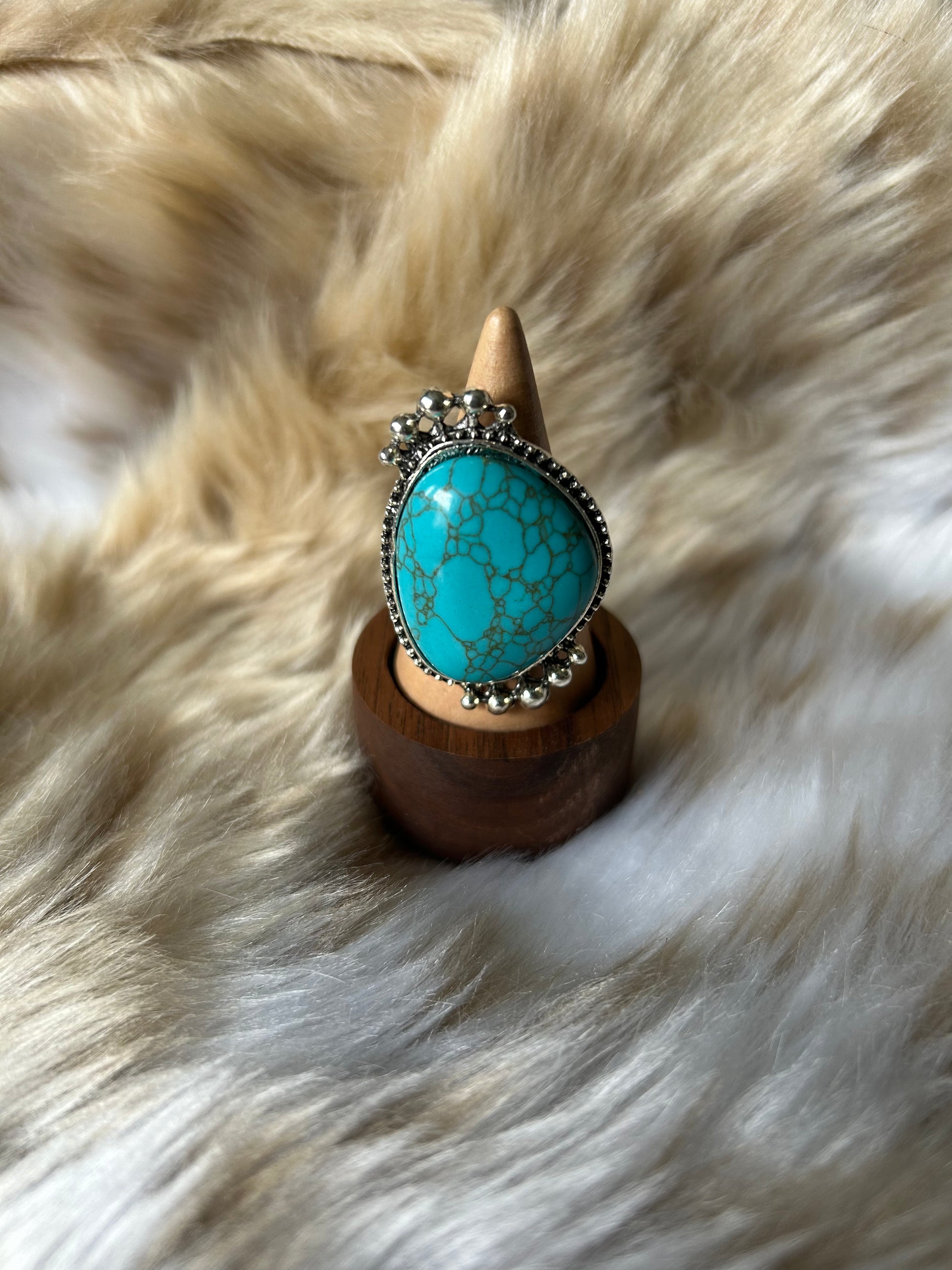 Bold and beautiful, the Maren Ring features an oversized turquoise stones set in antique silver with delicate beaded detailing. Designed to make a statement, this ring captures western charm with a touch of boho elegance. Whether styles with cozy flannels, layered jewelry, or your favorite fall outfit, the Maren Ring adds the perfect pop of color and individuality.Â