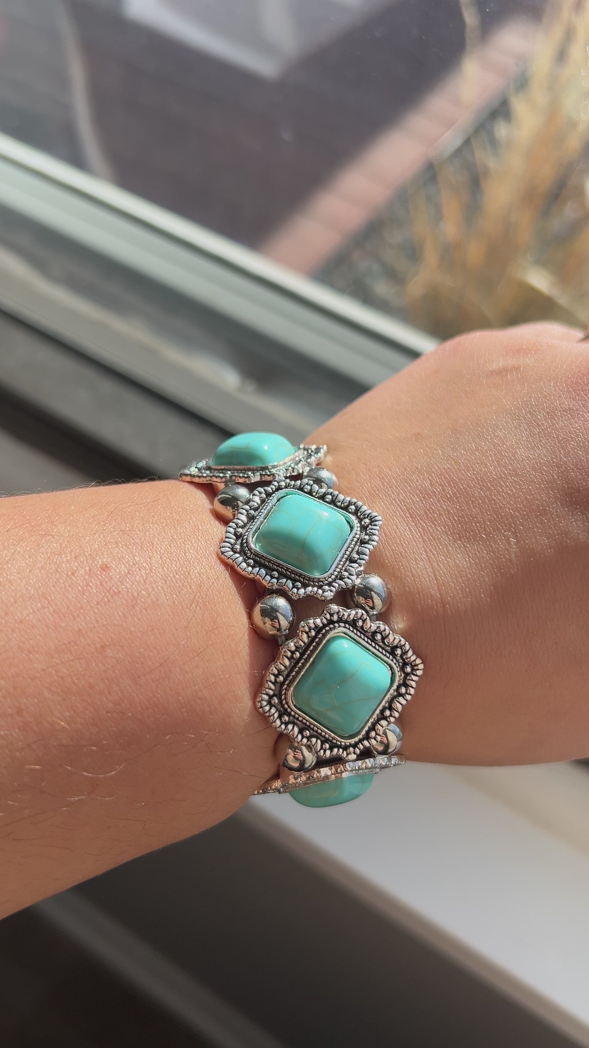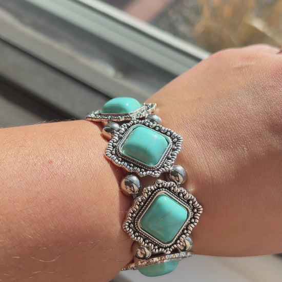 Western charm meets timeless style in our Mia Turquoise Bracelet — featuring bold turquoise stones set in detailed silver frames. The stretchy design makes it comfortable and easy to wear while giving your outfit that perfect touch of southwestern flair. A stunning piece to pair with denim, boots, or your favorite cozy layers.