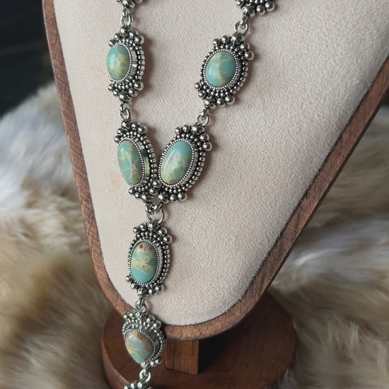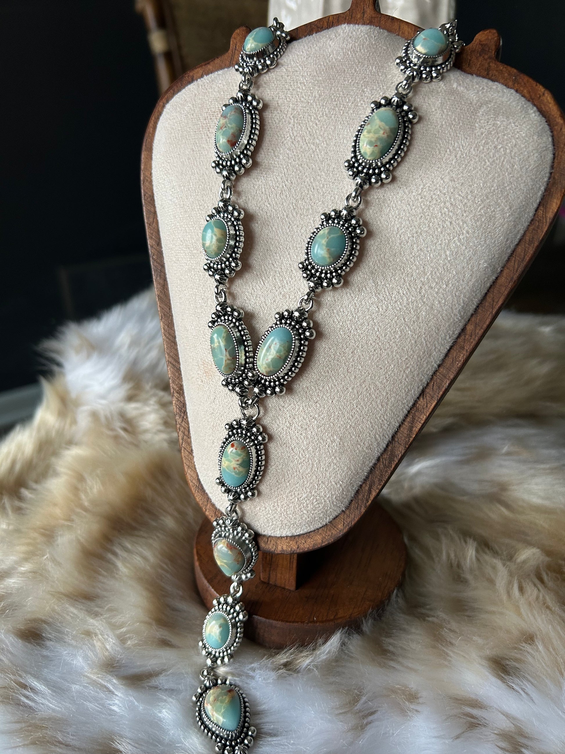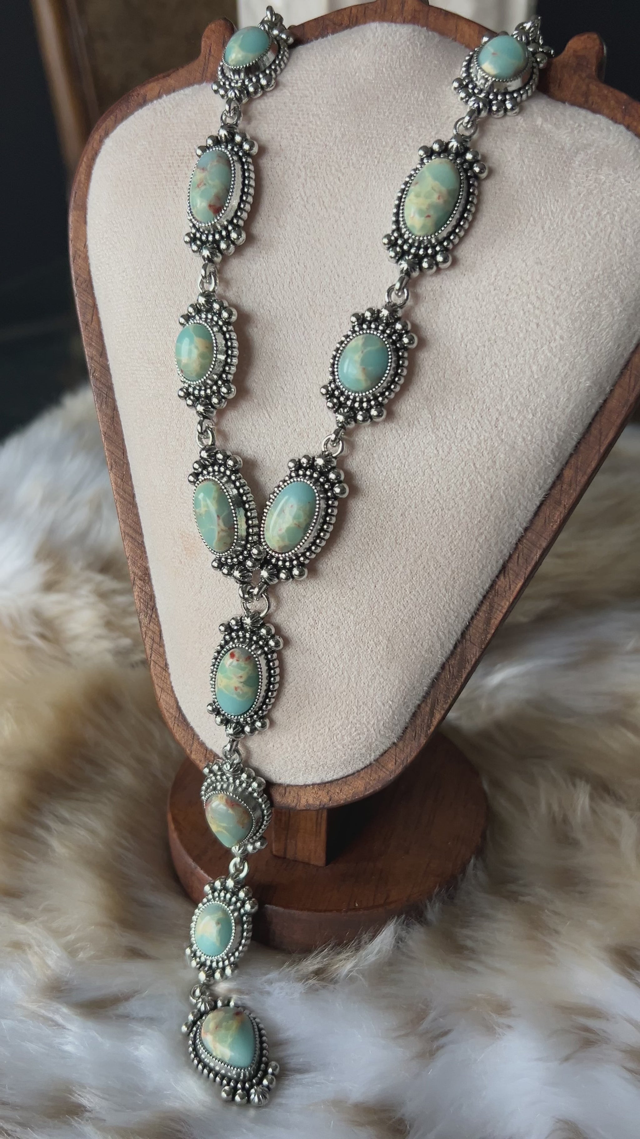 Meet Sage, a timeless statement piece that blends western charm with elegant femininity. This necklace features soft turquoise-style stones framed in intricate silver detailing, creating a look that’s both bold and beautifully vintage. It’s long, layered design makes it perfect for dressing up a simple outfit or I’m-letting a true western-boho ensemble.